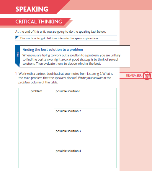 然后是正式的“口语表达”训练。结合本单元的口语任务,书中会教孩子一项可针对使用的“批判性思维”技能。