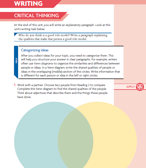 而第1-5级的两册,则分为 阅读写作与听力口语 双技能教程,每个环节中都融入了丰富的 批判性思维 的学习。