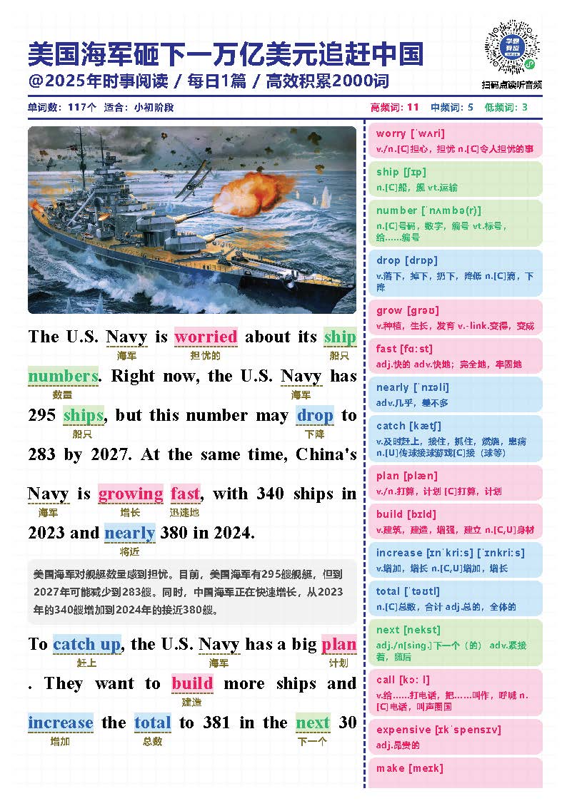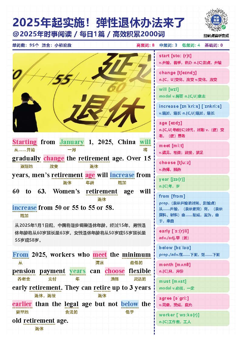 2025年时文短文+单词本+音频 ├─ 2025年时事短文单词本1-100篇.pdf ├─ 2025年时事短文电子版1-100篇.pdf ├─ 2025年时文短文音频101-138篇(更新中) │ ├─ D101 母亲节.mp3 │ ├─ D102 美官员惊到了!美国西海岸港口货船归零.mp3 │ ├─ D103 明星也卷学历!47岁黄晓明考博进复试.mp3 │ ├─ D104 为救同学错过高考的小伙能考试了.mp3 │ ├─ D105 郑钦文创历史 生涯首胜萨巴伦卡.mp3 │ ├─ D106 雷军官宣小米造芯.mp3 │ ├─ D107 潘展乐战胜孙杨 400米自由泳夺冠.mp3 │ ├─ D108 流失海外79载 国宝帛书回归祖国怀抱.mp3 │ ├─ D109 小满.mp3 │ ├─ D110 全红婵旧伤复发,退赛!.mp3 │ ├─ D112 哈佛近7000名留学生怎么办.mp3 │ ├─ D113 超75%在美科研人员考虑离开美国.mp3 │ ├─ D114 远离让你内耗的人.mp3 │ ├─ D115 王健林断臂求生,再卖48座万达广场.mp3 │ ├─ D116 首次下降!今年全国高考报名人数1335万.mp3 │ ├─ D117 境外游客涌入_中国游_ 带热 _中国购.mp3 │ ├─ D118 端午节.mp3 │ ├─ D119 太突然!樊振东加盟德国联赛.mp3 │ ├─ D120 郑钦文晋级法网女单八强,刷新最佳战绩.mp3 │ ├─ D121 凭什么,“苏超”这次火爆全国?.mp3 │ ├─ D122 芒种.mp3 │ ├─ D123 时隔68年客场再输!国足0-1不敌印尼.mp3 │ ├─ D124 全国高考今日开考,看看这些新变化.mp3 │ ├─ D125 高考答题为什么要用2B铅笔?.mp3 │ ├─ D126 先去做,做成一堆烂泥,再慢慢改.mp3 │ ├─ D127 高考不是终点,而是人生的新起点.mp3 │ ├─ D128 高考失利,人生就毁了吗?.mp3 │ ├─ D129 印度失事客机上242人全部遇难.mp3 │ ├─ D130 一娃难求!Labubu凭什么征服全球?.mp3 │ ├─ D131 父亲节.mp3 │ ├─ D132 幼儿园越来越少,一年关掉2万所.mp3 │ ├─ D133 动物能分辨生命体和会动的机器吗?.mp3 │ ├─ D134 中国高铁又快又稳的秘密是什么?.mp3 │ ├─ D135.贴地飞行!磁悬浮技术新突破.mp3 │ ├─ D136 以伊冲突,美国会下场吗.mp3 │ ├─ D137 Labubu大量补货造成二手价格腰斩.mp3 │ └─ D138 韦东奕连听3天讲座,这位女教授该有多厉害?.mp3 ├─ 2025年时文短文音频 1-100篇 │ ├─ D01 2025年起实施!弹性退休办法来了.mp3 │ ├─ D02 80%清华毕业生出国不归,真的吗?.mp3 │ ├─ D03 今日小寒.mp3 │ ├─ D04 刘强东给小学老师每人发10万元红.mp3 │ ├─ D05 美国加州大火完全失控超10万人撤离.mp3 │ ├─ D06 美国海军砸下一万亿美元追赶中国.mp3 │ ├─ D07 年仅7岁小学生获评国家一级运动员.mp3 │ ├─ D08 太牛啦!刘亦菲荣获总台视后.mp3 │ ├─ D09 智利车厘子价格暴跌,究竟为何?.mp3 │ ├─ D10 爆冷出局!澳网女单郑钦文被罚哭.mp3 │ ├─ D100 雷军_过去一个多月是我最艰难的时间.mp3 │ ├─ D11 终于!出生人口时隔七年后反弹.mp3 │ ├─ D12 二十四节气之大寒.mp3 │ ├─ D13小年.mp3 │ ├─ D14 突发!谷爱凌摔倒受伤退赛,不能走路.mp3 │ ├─ D15 新年狂飙!DeepSeek撼动全球AI市场.mp3 │ ├─ D16 美宣布对中国商品加征10%关税.mp3 │ ├─ D17 立春.mp3 │ ├─ D18 哪吒2上升至中国电影史票房第5.mp3 │ ├─ D19 春节假期中国国内出游5.01亿人次.mp3 │ ├─ D20 新冠军!哪吒2破中国影史票房纪录!.mp3 │ ├─ D21 中国核潜艇之父黄旭华.mp3 │ ├─ D22 你敢信!《哪吒2》的风吹到了美国.mp3 │ ├─ D23 《哪吒2》中国影史第一个80亿.mp3 │ ├─ D24 机器人扭秧歌:科技与传统美妙共舞.mp3 │ ├─ D25 哪吒敖丙闹元宵,上央视啦.mp3 │ ├─ D26 哪吒2闯进全球动画电影票房榜前二.mp3 │ ├─ D27 美国鸡蛋价格达45年来最高点.mp3 │ ├─ D28 《哪吒2》成全球动画电影票房榜第1.mp3 │ ├─ D29 过分丝滑!机器人跳舞太灵活被标疑AI生成.mp3 │ ├─ D30 哪吒2的百亿巨款票房怎么分.mp3 │ ├─ D31 DeepSeek评中国最宜居城市.mp3 │ ├─ D32 超级计算机算出人类灭绝时间.mp3 │ ├─ D33 《哪吒2》在香港被恶意打低分.mp3 │ ├─ D34 中国首个机器人大厨获批上岗.mp3 │ ├─ D35 宇树机器人大秀中国功夫.mp3 │ ├─ D36 七星连珠77年一遇?当真罕见?.mp3 │ ├─ D37 DeepSeek最高日赚346万元.mp3 │ ├─ D38 首部票房破20亿美元亚洲电影.mp3 │ ├─ D39 突破!中国发布超导量子计算原型机.mp3 │ ├─ D40 惊蛰.mp3 │ ├─ D41 国产AI再出王炸!会自己干活的Manus.mp3 │ ├─ D42 妇女节 Women's Day.mp3 │ ├─ D43 再次超越!哪吒2票房进入全球前6.mp3 │ ├─ D44 国家版减肥指南很“潮”也很“暖”.mp3 │ ├─ D45 集体反内卷,加班文化开始退潮.mp3 │ ├─ D46 起猛了!机器人会骑自行车了.mp3 │ ├─ D47 黄焖鸡米饭外卖,你还敢吃吗?.mp3 │ ├─ D48 热搜第一!哪吒2票房超150亿.mp3 │ ├─ D49 315报道_手机抽奖疯狂敛财,1天流水达20亿.mp3 │ ├─ D50 王楚钦战胜林诗栋重庆赛夺冠.mp3 │ ├─ D51 中国首个太空采矿机器人诞生.mp3 │ ├─ D52 每天多刷1小时手机,视网膜恐衰老32天.mp3 │ ├─ D53 春分.mp3 │ ├─ D54 国足出线概率,直接晋级2.6%.mp3 │ ├─ D55 刘翔之后又有中国运动员夺牌了.mp3 │ ├─ D56 中国影史首位!饺子导演票房超200亿.mp3 │ ├─ D57 惊!中国机器人在10666米海底漫步.mp3 │ ├─ D58 国足不敌澳大利亚队 无缘直通世界杯.mp3 │ ├─ D59 苹果向浙大捐赠3000万.mp3 │ ├─ D60 艳妮首次登顶亚洲第一.mp3 │ ├─ D61 缅甸发生7.9级地震.mp3 │ ├─ D62 愚人节.mp3 │ ├─ D63 雷军回应SU7爆燃事故.