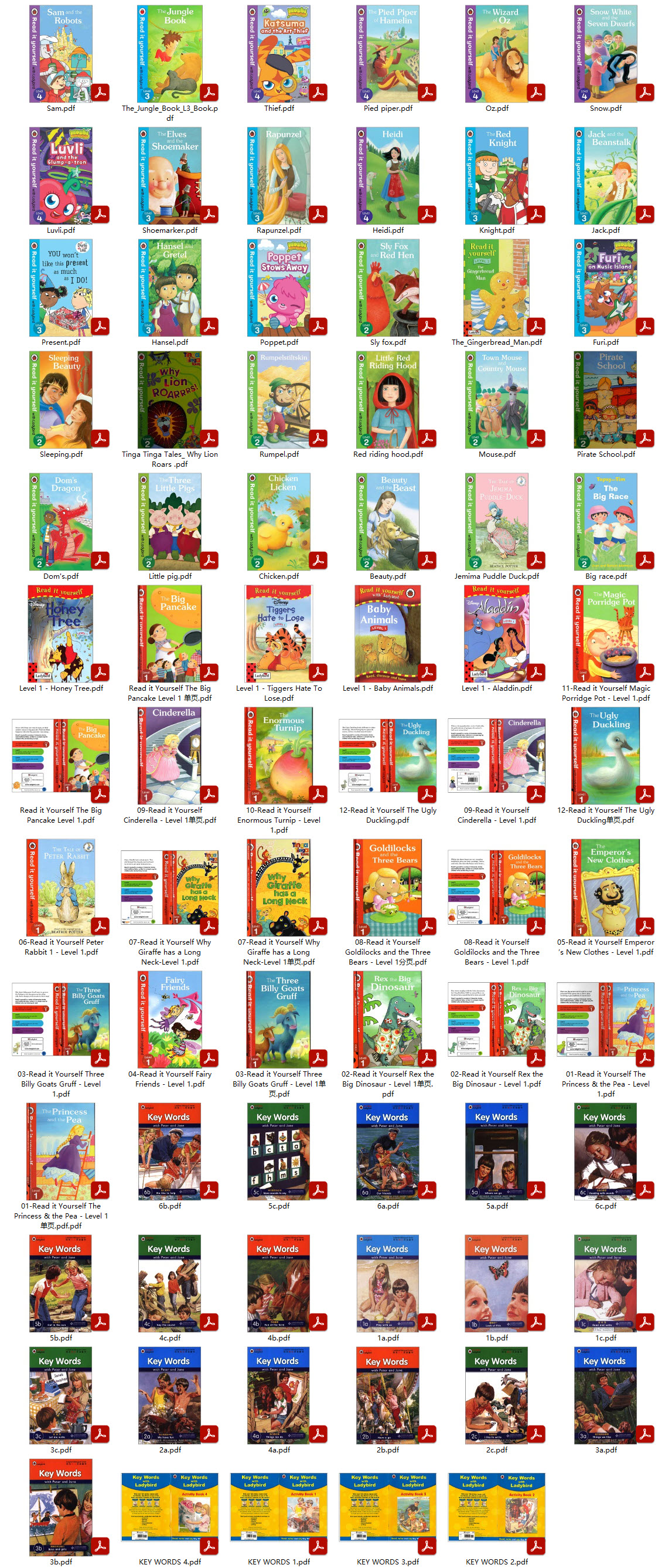 英国经典儿童英语分级读物《Ladybird 快乐瓢虫分级阅读》(Key Words+Read It Yourself) 书+音频 ├─ 快乐瓢虫双语童书 Key Words 音频mp3 │ ├─ 01A.mp3 │ ├─ 01B.mp3 │ ├─ 02A.mp3 │ ├─ 02B.mp3 │ ├─ 03A.mp3 │ ├─ 03B.mp3 │ ├─ 04A.mp3 │ ├─ 04B.mp3 │ ├─ 05A.mp3 │ ├─ 05B.mp3 │ ├─ 06A.mp3 │ ├─ 06B.mp3 │ ├─ 07A.mp3 │ ├─ 07B.mp3 │ ├─ 08A.mp3 │ ├─ 08B.mp3 │ ├─ 09A.mp3 │ ├─ 09B.mp3 │ ├─ 10A.mp3 │ ├─ 10B.mp3 │ ├─ 11A.mp3 │ ├─ 11B.mp3 │ ├─ 12A.mp3 │ └─ 12B.mp3 ├─ 快乐瓢虫双语童书 Key Words PDF │ ├─ 1a.pdf │ ├─ 1b.pdf │ ├─ 1c.pdf │ ├─ 2a.pdf │ ├─ 2b.pdf │ ├─ 2c.pdf │ ├─ 3a.pdf │ ├─ 3b.pdf │ ├─ 3c.pdf │ ├─ 4a.pdf │ ├─ 4b.pdf │ ├─ 4c.pdf │ ├─ 5a.pdf │ ├─ 5b.pdf │ ├─ 5c.pdf │ ├─ 6a.pdf │ ├─ 6b.pdf │ └─ 6c.pdf ├─ Read It yourself 快乐瓢虫分级阅读1~4级(音频+pdf) │ ├─ Ladybird Read it Yourself L4 │ │ ├─ 1-Read it Yourself Pied Piper of Hamelin - Level 4.mp3 │ │ ├─ 2-Read it Yourself Wizard of Oz - Level 4.mp3 │ │ ├─ 3-Read it Yourself Heidi - Level 4.mp3 │ │ ├─ 4-Read it Yourself Snow White - Level 4.mp3 │ │ ├─ 5-Read it Yourself Sam and the Robot - Level 4.mp3 │ │ ├─ 6- katsuma and the art thief - level 4.wma │ │ ├─ 7-luvli and the glump-a-tron level 4.wma │ │ └─ Level 4 │ │ ├─ Heidi.pdf │ │ ├─ Luvli.pdf │ │ ├─ Oz.pdf │ │ ├─ Pied piper.pdf │ │ ├─ Sam.pdf │ │ ├─ Snow.pdf │ │ └─ Thief.pdf │ ├─ Ladybird Read it Yourself L3 │ │ ├─ 1-Read it Yourself Jack and the Beanstalk - Level 3.mp3 │ │ ├─ 2-Read it Yourself Elves and the Shoemaker - Level 3.mp3 │ │ ├─ 3-Read it Yourself Rapunzel - Level 3.mp3 │ │ ├─ 4-Read it Yourself Hansel and Gretel - Level 3.mp3 │ │ ├─ 5-Read it Yourself The Red Knight - Level 3.mp3 │ │ ├─ 6-Read it Yourself The Jungle Book.mp3 │ │ ├─ 7-you won‘t like this present as much as i do!level 3.wma │ │ ├─ 8- poppet stows away level 3.wma │ │ └─ Level3 │ │ ├─ Furi.pdf │ │ ├─ Hansel.pdf │ │ ├─ Jack.pdf │ │ ├─ Knight.pdf │ │ ├─ Poppet.pdf │ │ ├─ Present.pdf │ │ ├─ Rapunzel.pdf │ │ ├─ Shoemarker.pdf │ │ └─ The_Jungle_Book_L3_Book.pdf │ ├─ Ladybird Read it Yourself L2 │ │ ├─ 01-Read it Yourself Sleeping Beauty - Level 2.mp3 │ │ ├─ 02-Read it Yourself Gingerbread Man - Level 2.mp3 │ │ ├─ 03-Read it Yourself Town Mouse and Country Mouse - Level 2.mp3 │ │ ├─ 04-Read it Yourself Beauty & the Beast - Level 2.mp3 │ │ ├─ 05-Read it Yourself Three Little Pigs - Level 2.mp3 │ │ ├─ 06-Read it Yourself Chicken Licken - Level 2.mp3 │ │ ├─ 07-Read it Yourself Rumpelstiltskin - Level 2.mp3 │ │ ├─ 08-Read it Yourself Dom's Dragon - Level 2.mp3 │ │ ├─ 09-Read it Yourself Pirate School - Level 2.mp3 │ │ ├─ 10-Read it Yourself Jemima Puddle Duck - Level 2.mp3 │ │ ├─ 11-Read it Yourself Tinga Tinga - Why Lion Roars - Level 2.mp3 │ │ ├─ 12-Read it Yourself topsy and tim the big race - level 2.wma │ │ ├─ 13-Read it Yourself Sly Fox and Red Hen - Level 2.mp3 │ │ ├─ 14-Read it Yourself Little Red Riding Hood - Level 2.mp3 │ │ └─ Level2 │ │ ├─ Beauty.pdf │ │ ├─ Big race.pdf │ │ ├─ Chicken.pdf │ │ ├─ Dom's.pdf │ │ ├─ Jemima Puddle Duck.pdf │ │ ├─ Little pig.pdf │ │ ├─ Mouse.pdf │ │ ├─ Pirate School.pdf │ │ ├─ Red riding hood.pdf │ │ ├─ Rumpel.pdf │ │ ├─ Sleeping.pdf │ │ ├─ Sly fox.pdf │ │ ├─ The_Gingerbread_Man.pdf │ │ └─ Tinga Tinga Tales_ Why Lion Roars .pdf │ └─ Ladybird Read it Yourself L1 │ ├─ 01-Read it Yourself The Princess & the Pea - Level 1.mp3 │ ├─ 01-Read it Yourself The Princess & the Pea - Level 1.pdf │ ├─ 01-Read it Yourself The Princess & the Pea - Level 1单页.pdf.pdf │ ├─ 02-Read it Yourself Rex the Big Dinosaur - Level 1.mp3 │ ├─ 02-Read it Yourself Rex the Big Dinosaur - Level 1.pdf │ ├─ 02-Read it Yourself Rex the Big Dinosaur - Level 1单页.pdf │ ├─ 03-Read it Yourself Three Billy Goats Gruff - Level 1.mp3 │ ├─ 03-Read it Yourself Three Billy Goats Gruff - Level 1.pdf │ ├─ 03-Read it Yourself Three Billy Goats Gruff - Level 1单页.pdf │ ├─ 04-Read it Yourself Fairy Friends - Level 1.mp3 │ ├─ 04-Read it Yourself Fairy Friends - Level 1.pdf │ ├─ 05-Read it Yourself Emperor’s New Clothes - Level 1.mp3 │ ├─ 05-Read it Yourself Emperor’s New Clothes - Level 1.pdf │ ├─ 06-Read it Yourself Peter Rabbit 1 - Level 1.mp3 │ ├─ 06-Read it Yourself Peter Rabbit 1 - Level 1.pdf │ ├─ 07-Read it Yourself Why Giraffe has a Long Neck-Level 1.mp3 │ ├─ 07-Read it Yourself Why Giraffe has a Long Neck-Level 1.pdf │ ├─ 07-Read it Yourself Why Giraffe has a Long Neck-Level 1单页.pdf │ ├─ 08-Read it Yourself Goldilocks and the Three Bears - Level 1.mp3 │ ├─ 08-Read it Yourself Goldilocks and the Three Bears - Level 1.pdf │ ├─ 08-Read it Yourself Goldilocks and the Three Bears - Level 1分页.pdf │ ├─ 09-Read it Yourself Cinderella - Level 1.mp3 │ ├─ 09-Read it Yourself Cinderella - Level 1.pdf │ ├─ 09-Read it Yourself Cinderella - Level 1单页.pdf │ ├─ 10-Read it Yourself Enormous Turnip - Level 1.mp3 │ ├─ 10-Read it Yourself Enormous Turnip - Level 1.pdf │ ├─ 11-Read it Yourself Magic Porridge Pot - Level 1.mp3 │ ├─ 11-Read it Yourself Magic Porridge Pot - Level 1.pdf │ ├─ 12-Read it Yourself The Ugly Duckling.mp3 │ ├─ 12-Rea