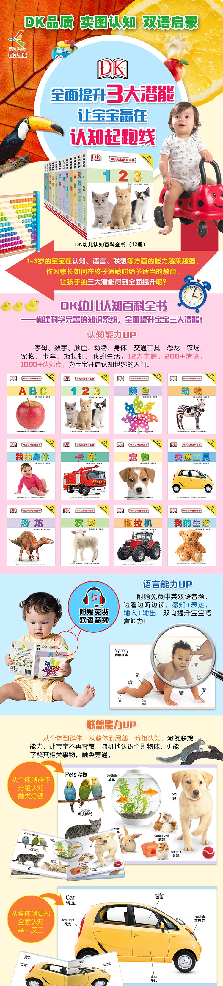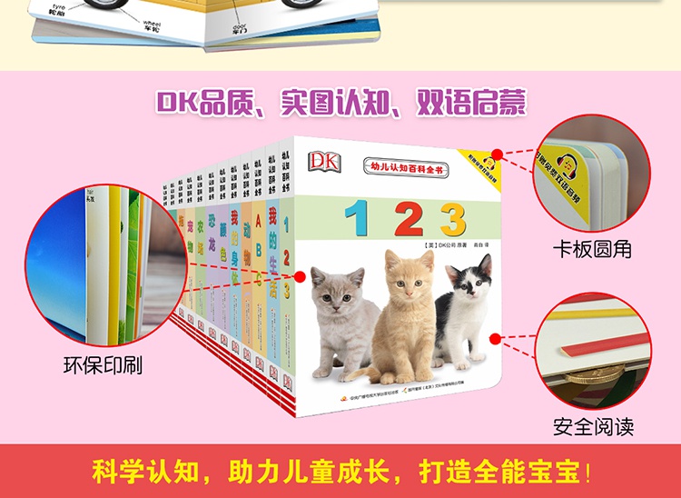 DK幼儿认知百科全书共12册,内容不仅涵盖常见的认知系列,数字、字母、颜色、动物、交通工具等,还包括生活环境、拖拉机、恐龙、宠物等新奇领域。全系列采用英国DK公司高清原版图片,并配有、科学的译文。本套图书中英双语,附赠音频。内容方面分为12大主题,约有200多个情境,1000多个认知点,3000多个双语词汇,大信息量,满足1-3岁宝宝的认知需求。全套采用情境认知的方式,由整体到局部,方便宝宝更好地融入其中。