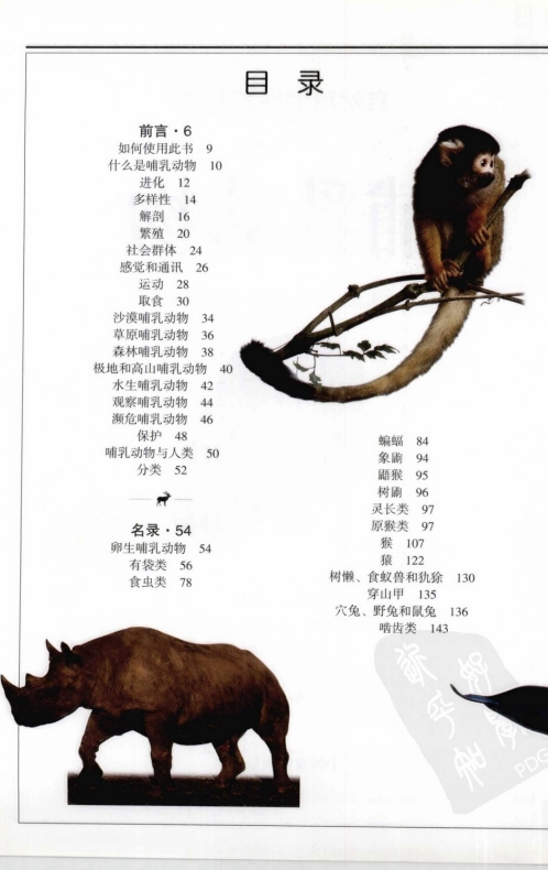 专家手笔,适合于初学者和动物爱好者。这本迷人的手册还包含了对每种动物的分类、进化、解剖和繁殖等各个方面的介绍,并讨论了保护现状和哺乳动物在当今世界上面临的威胁。除此之外,简明的名词解释对书中的一些技术和科学术语进行了明确的定义。