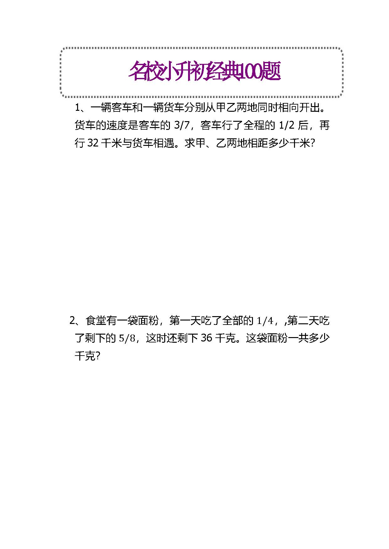 小学数学名校小升初经典100题(高清PDF电子版可打印)
